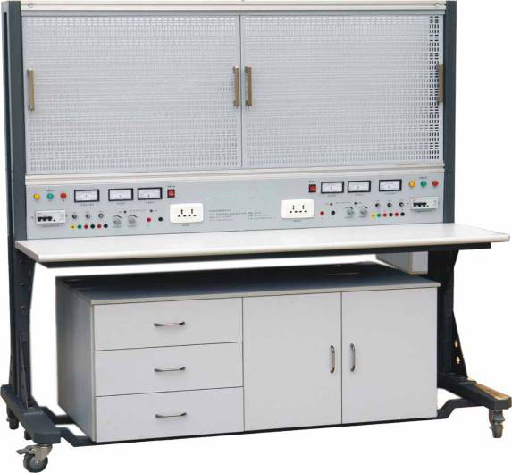 本实训台由实训屏(内置电源)、实训桌、实训储物柜三大部分组成。以30mm×30mm成型方钢作为设备主要框架材料;实训屏、地盘采用焊接连接、关键部位采用三角筋用内六角螺钉加固连接,表面经高温喷塑处理,美观大方且有效起到防锈绝缘的作用;由两条35mm×35mm铝合金型材及滑槽组成网孔板固定机构;固定机构的下方是铁制双工位电源箱,每工位电源箱的布局依次为电源保护装置、电源指示装置、电源输出;实训桌桌面采用25mm麻灰色高密度层压板封边特制,有效提高绝缘等级;实验桌底部装有至少4个导向轮,方便实训台架移动;